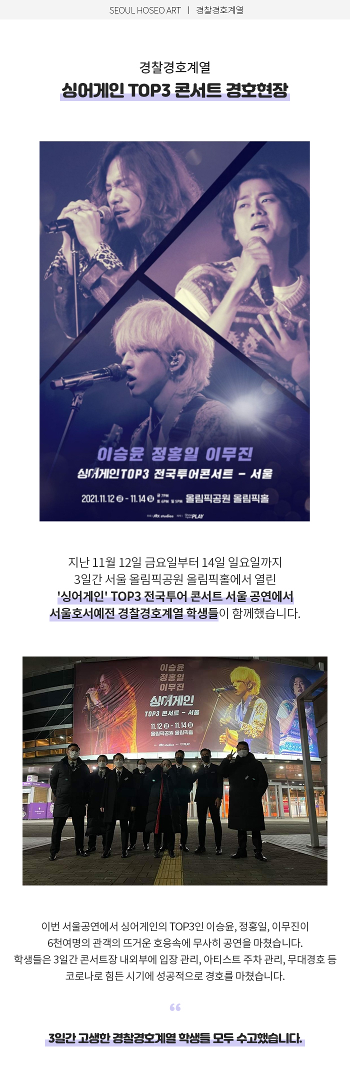 서울호서예술실용전문학 경찰경호계열 싱어게인 TOP3 콘서트 경호현장 지난 11월 12일 금요일부터 14일 일요일까지 3일간 서울 올림픽공원 올림픽홀에서 열린 '싱어게인' TOP3 전국투어 콘서트 서울 공연에서 서울호서예전 경찰경호계열 학생들이 함께했습니다.