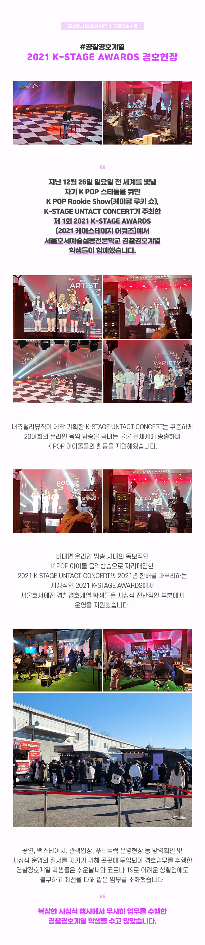 서울호서예술실용전문학교 경찰경호계열 2021 K-STAGE AWARDS 경호현장 지난 12월 26일 일요일 전 세계를 빛낼 차기 K POP 스타들을 위한 K POP Rookie Show(케이팝 루키 쇼), K-STAGE UNTACT CONCERT가 주최한 제 1회 2021 K-STAGE AWARDS(2021 케이스테이지 어워즈)에서 서울호서예술실용전문학교 경찰경호계열 학생들이 함께했습니다.