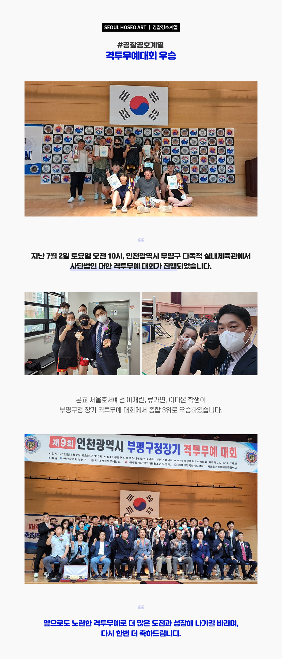 지난 7월 2일 토요일 오전 10시, 인천광역시 부평구 다목적 실내체육관에서 사단법인 대한 격투무예 대회가 진행되었습니다. 본교 서울호서예전 이채린, 류가연, 이다온 학생이 부평구청 장기 격투무예 대회에서 종합 3위로 우승하였습니다.