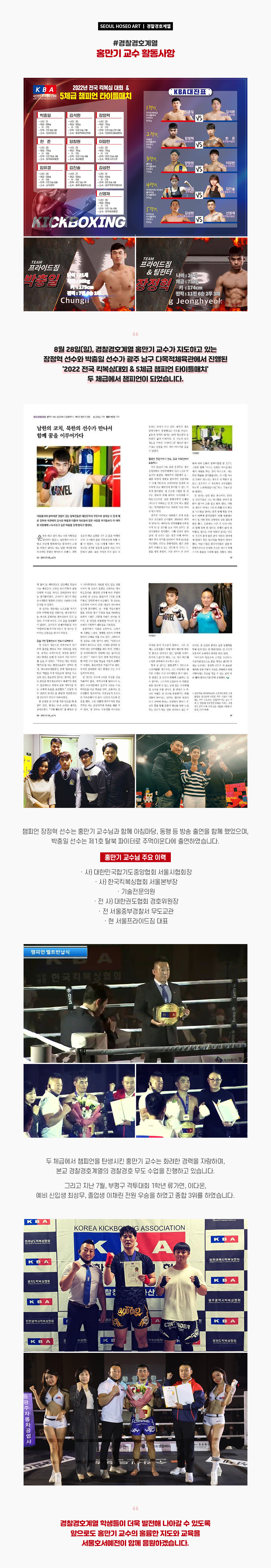 8월 28일(일), 경찰경호계열 홍만기 교수가 지도하고 있는 장정혁 선수와 박충일 선수가 광주 남구 다목적체육관에서 진행된 '2022 전국 킥복싱대회 & 5체급 챔피언 타이틀매치' 두 체급에서 챔피언이 되었습니다. 챔피언 장정혁 선수는 홍만기 교수님과 함께 아침마당, 동행 등 방송 출연을 함께 했었으며, 박충일 선수는 제1호 탈북 파이터로 주먹이운다에 출연하였습니다.