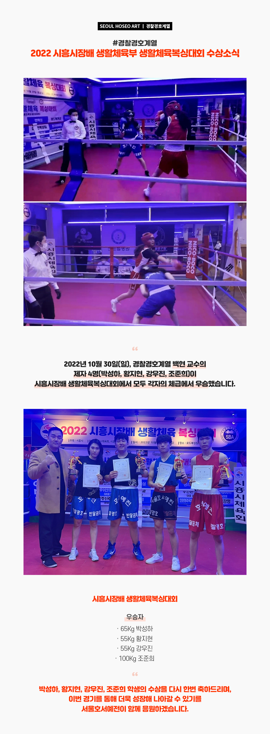 2022년 10월 30일(일), 경찰경호계열 백현 교수의 제자 4명(박성하, 황지현, 강우진, 조준희)이 시흥시장배 생활체육복싱대회에서 모두 각자의 체급에서 우승했습니다.