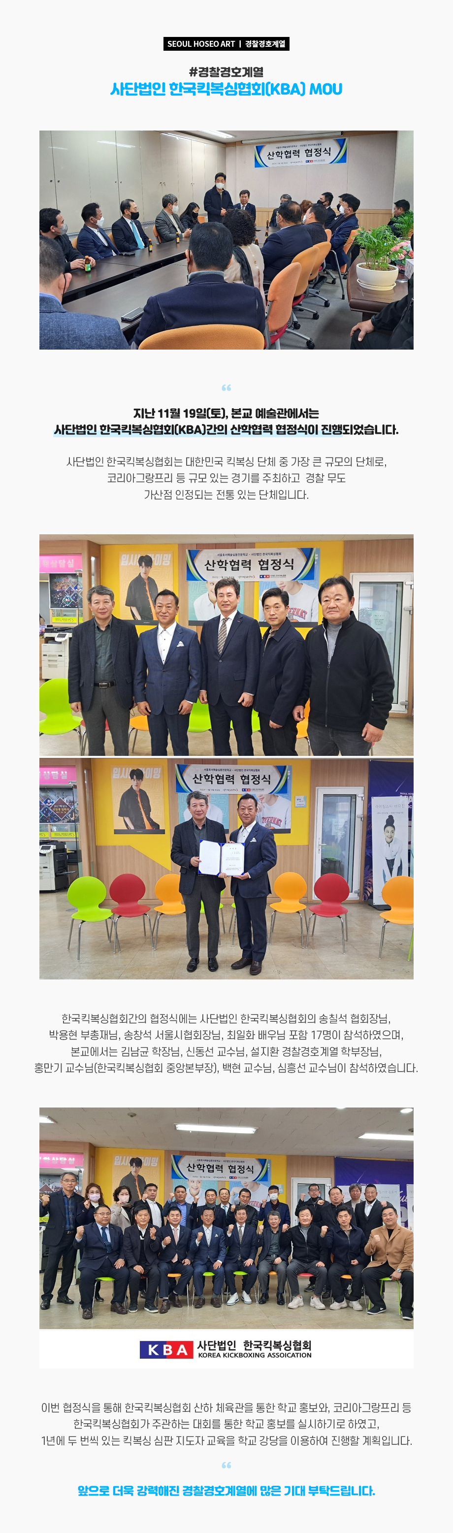 지난 11월 19일(토), 본교 예술관에서는 사단법인 한국킥복싱협회(KBA)간의 산학협력 협정식이 진행되었습니다. 사단법인 한국킥복싱협회는 대한민국 킥복싱 단체 중 가장 큰 규모의 단체로, 코리아그랑프리 등 규모 있는 경기를 주최하고 경찰 무도 가산점 인정되는 전통 있는 단체입니다.