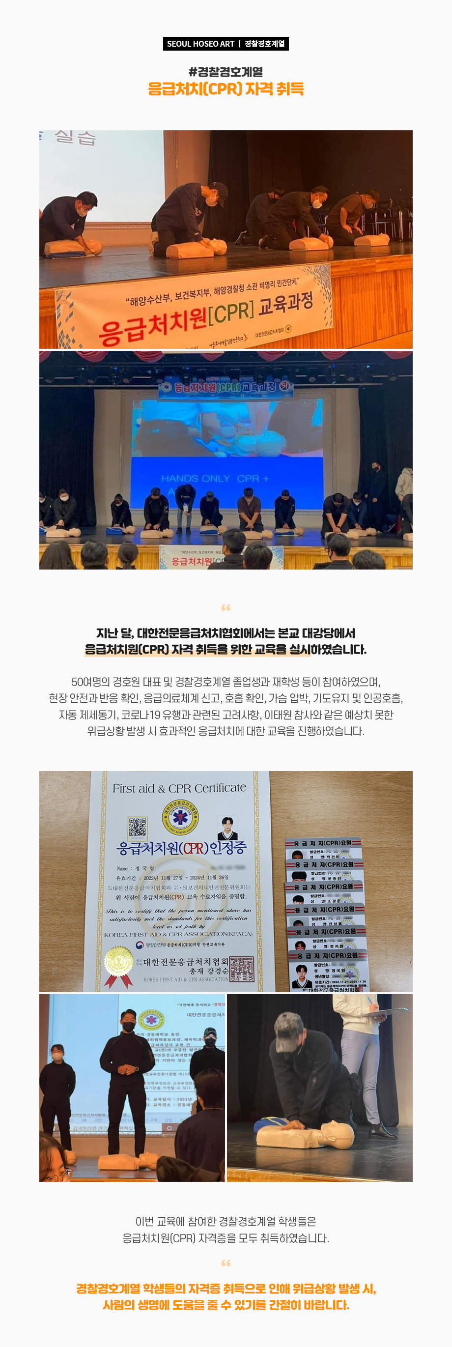 지난 달, 대한전문응급처치협회에서는 본교 대강당에서 응급처치원(CPR) 자격 취득을 위한 교육을 실시하였습니다. 50여명의 경호원 대표 및 경찰경호계열 졸업생과 재학생 등이 참여하였으며, 현장 안전과 반응 확인, 응급의료체계 신고, 호흡 확인, 가슴 압박, 기도유지 및 인공호흡, 자동 제세동기, 코로나19 유행과 관련된 고려사항, 이태원 참사와 같은 예상치 못한 위급상황 발생 시 효과적인 응급처치에 대한 교육을 진행하였습니다.