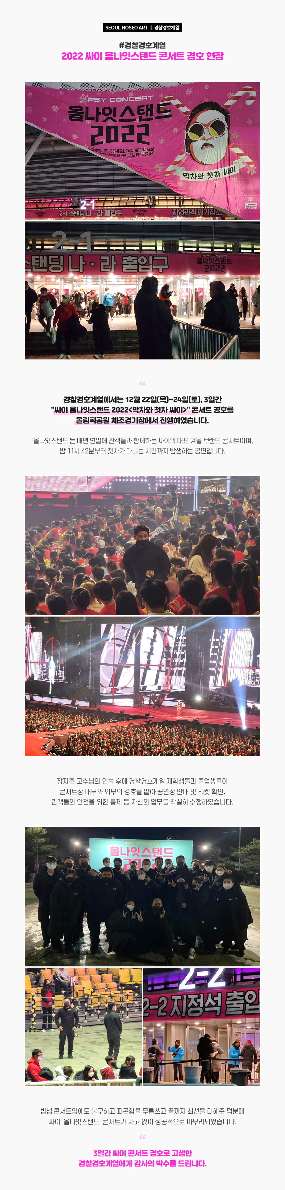 경찰경호계열에서는 12월 22일(목)~24일(토), 3일간 "싸이 올나잇스탠드 2022<막차와 첫차 싸이>" 콘서트 경호를 올림픽공원 체조경기장에서 진행하였습니다.