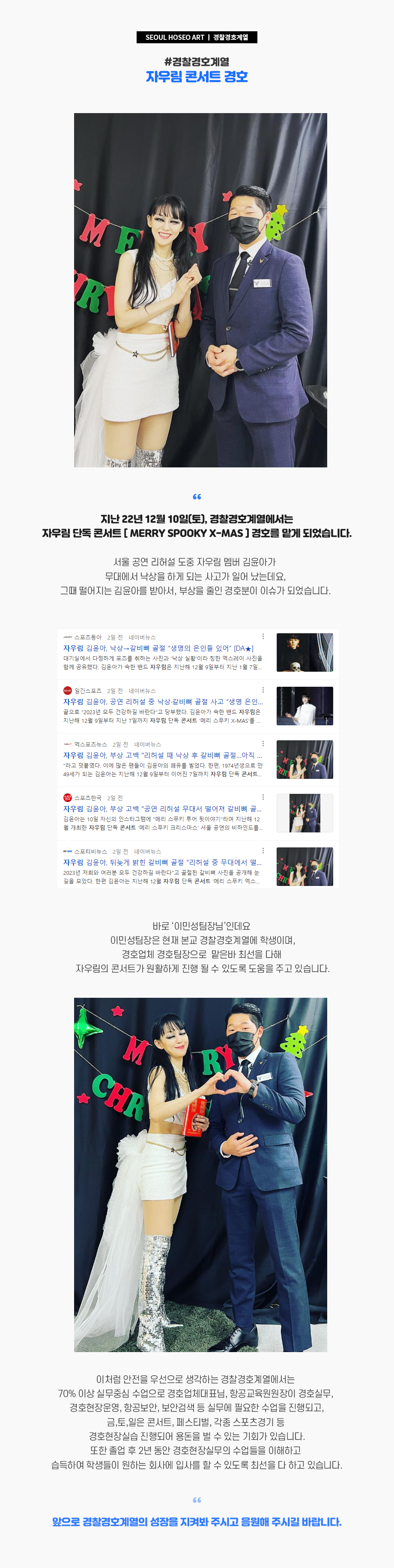서울호서예술실용전문학교 경찰경호계열에서는 12월 10일 자우림의 콘서트 경호를 맡게 되었습니다. 서울 공연 리허설 도중 자우림 멤버 김윤아가 무대에서 낙상을 하게 되는 사고가 일어 났는데요, 그때 떨어지는 김윤아를 받아서, 부상을 줄인 경호분이 이슈가 되었습니다. 바로 이민성팀장님인데요 이민성팀장은 현재 본교 경찰경호계열에 재학중이며, 경호로써 맡은바 최선을 다해 자우림의 콘서트가 원활하게 진행 될 수 있도록 도움을 주었습니다.