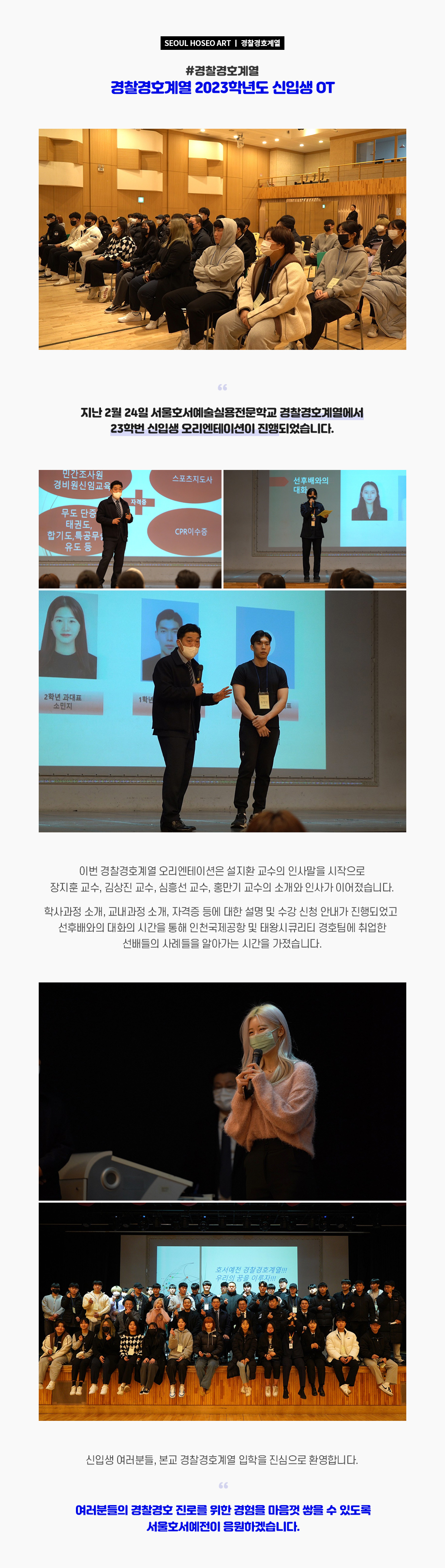 지난 2월 24일 서울호서예술실용전문학교 경찰경호계열에서 23학번 신입생 오리엔테이션이 진행되었습니다. 이번 경찰경호계열 오리엔테이션은 설지환 교수의 인사말을 시작으로 장지훈 교수, 김상진 교수, 심흥선 교수, 홍만기 교수의 소개와 인사가 이어졌습니다.