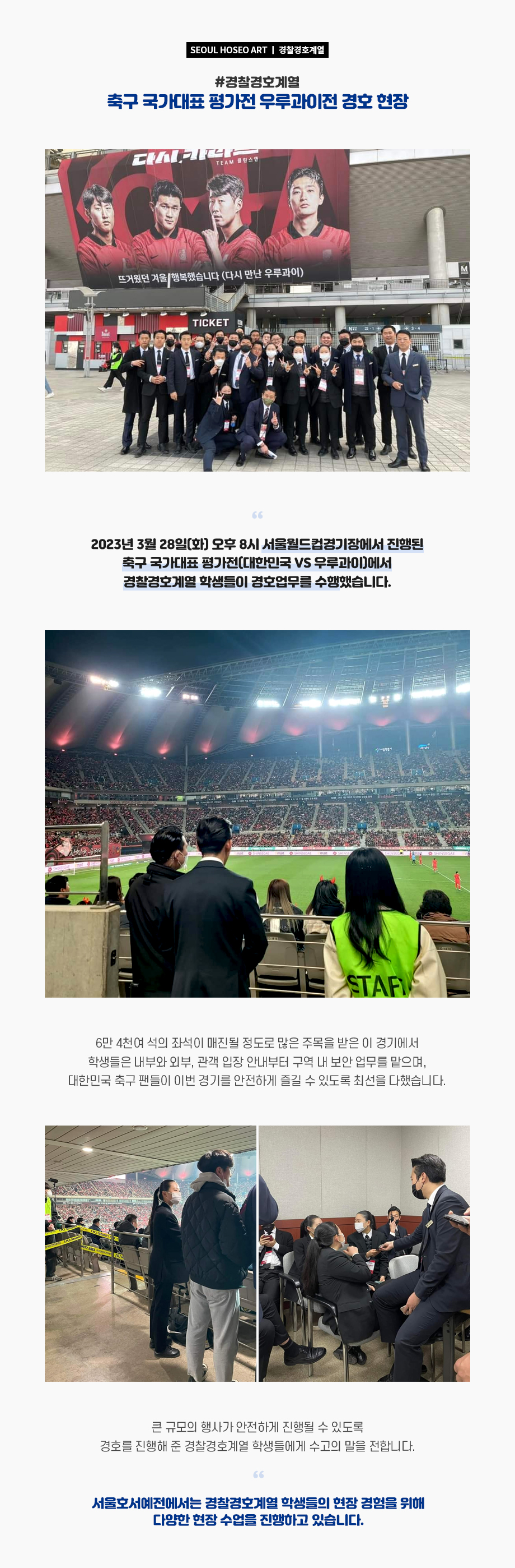 2023년 3월 28일(화) 오후 8시 서울월드컵경기장에서 진행된 축구 국가대표 평가전(대한민국 VS 우루과이)에서 경찰경호계열 학생들이 경호업무를 수행했습니다. 6만 4천여 석의 좌석이 매진될 정도로 많은 주목을 받은 이 경기에서 학생들은 내부와 외부, 관객 입장 안내부터 구역 내 보안 업무를 맡으며, 대한민국 축구 팬들이 이번 경기를 안전하게 즐길 수 있도록 최선을 다했습니다.