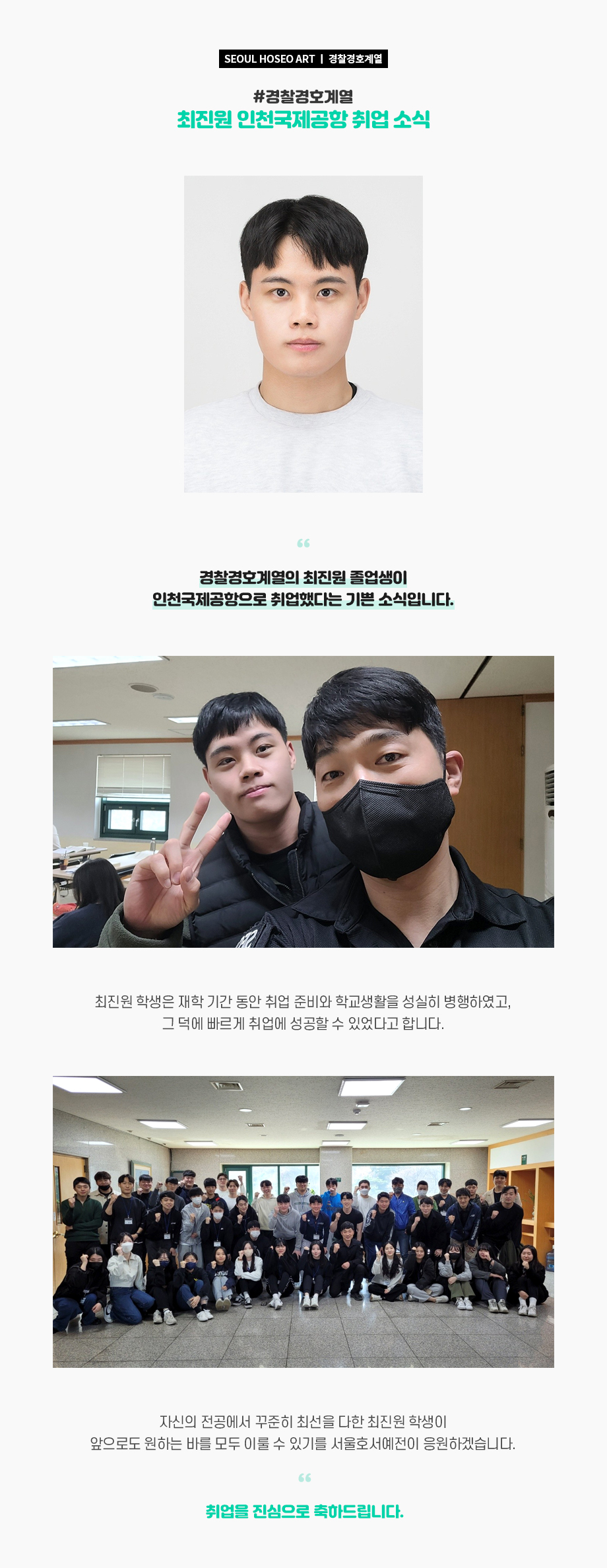 서울호서예술실용전문학교 경찰경호계열의 최진원 졸업생이 인천국제공항으로 취업했다는 기쁜 소식입니다. 최진원 학생은 재학 기간 동안 취업 준비와 학교생활을 성실히 병행하였고, 그 덕에 빠르게 취업에 성공할 수 있었다고 합니다.