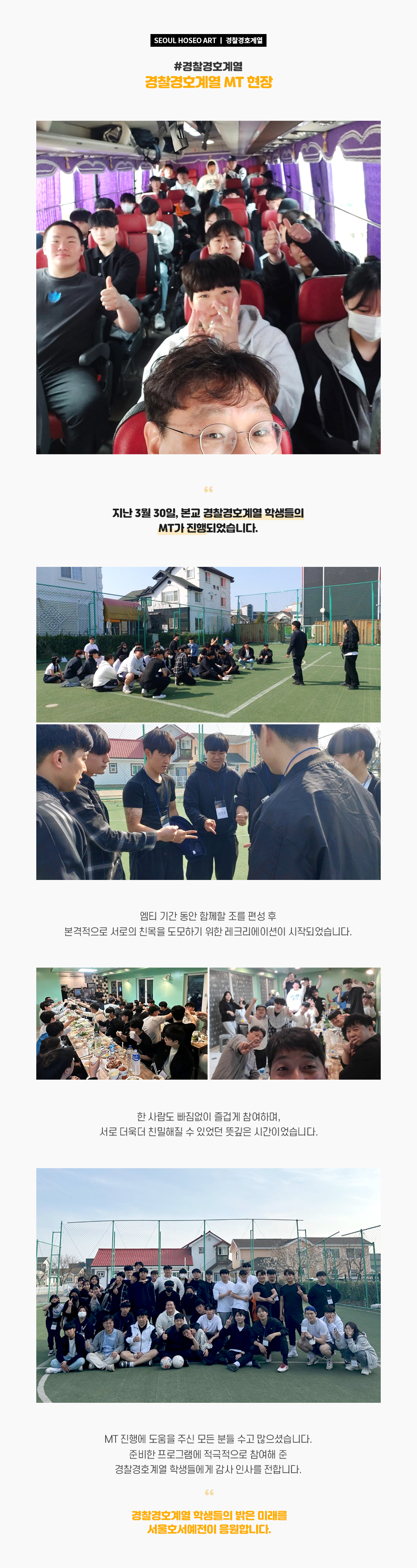 지난 3월 30일, 본교 경찰경호계열 학생들의 MT가 진행되었습니다. 엠티 기간 동안 함께할 조를 편성 후 본격적으로 서로의 친목을 도모하기 위한 레크리에이션이 시작되었습니다.