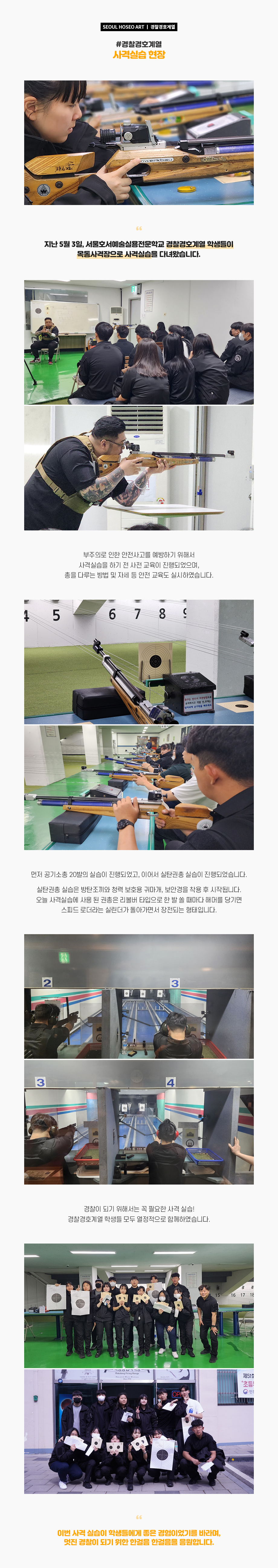 지난 5월 3일, 서울호서예술실용전문학교 경찰경호계열 학생들이 목동사격장으로 사격실습을 다녀왔습니다. 부주의로 인한 안전사고를 예방하기 위해서 사격실습을 하기 전 사전 교육이 진행되었으며, 총을 다루는 방법 및 자세 등 안전 교육도 실시하였습니다.
