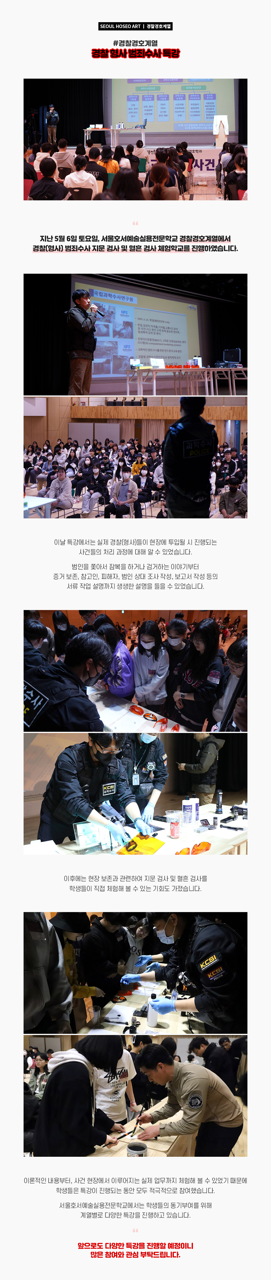 지난 5월 6일 토요일, 서울호서예술실용전문학교 경찰경호계열에서 경찰(형사) 범죄수사 지문 검사 및 혈흔 검사 체험학교를 진행하였습니다. 이날 특강에서는 실제 경찰(형사)들이 현장에 투입될 시 진행되는 사건들의 처리 과정에 대해 알 수 있었습니다. 범인을 쫓아서 잠복을 하거나 검거하는 이야기부터 증거 보존, 참고인, 피해자, 범인 상대 조사 작성, 보고서 작성 등의 서류 작업 설명까지 생생한 설명을 들을 수 있었습니다.