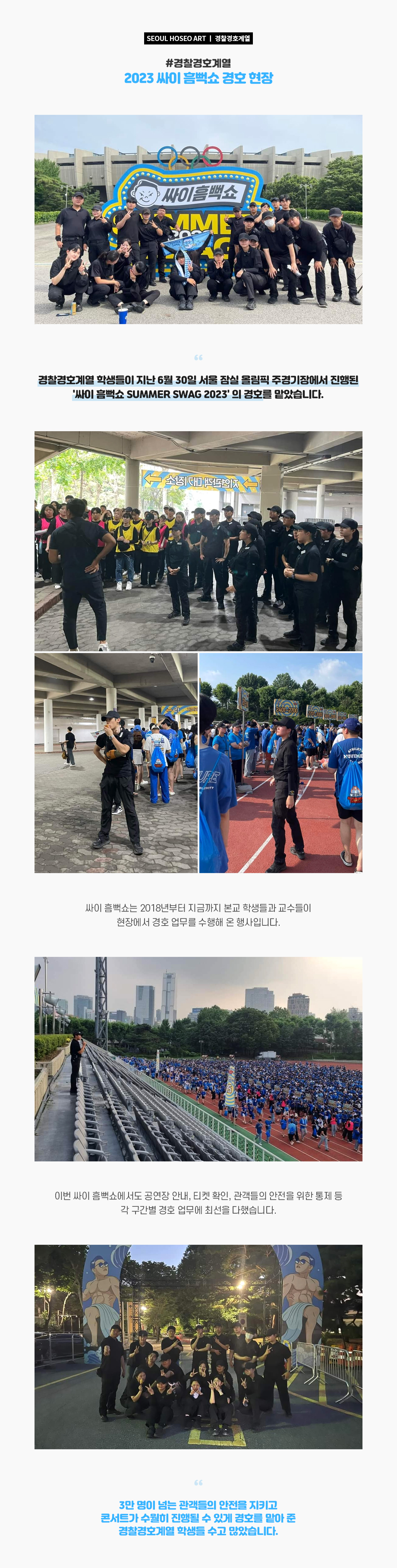경찰경호계열 학생들이 지난 6월 30일 서울 잠실 올림픽 주경기장에서 진행된 '싸이 흠뻑쇼 SUMMER SWAG 2023' 의 경호를 맡았습니다. 싸이 흠뻑쇼는 2018년부터 지금까지 본교 학생들과 교수들이 현장에서 경호 업무를 수행해 온 행사입니다.