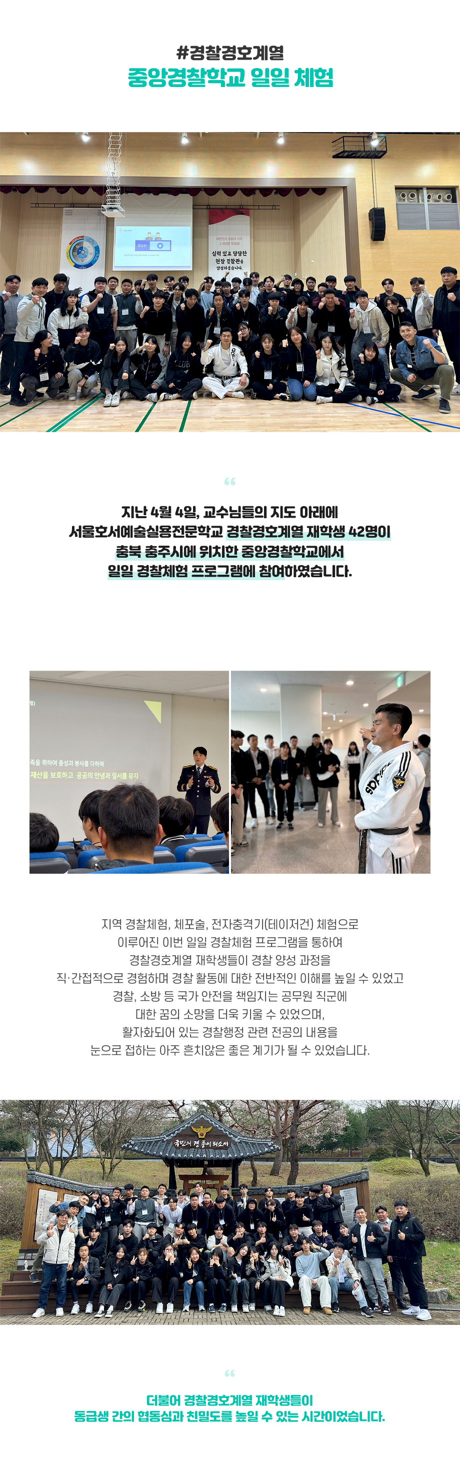 지난 4월 4일, 교수님들의 지도 아래에 서울호서예술실용전문학교 경찰경호계열 재학생 42명이 충북 충주시에 위치한 중앙경찰학교에서 일일 경찰체험 프로그램에 참여하였습니다. 지역 경찰체험, 체포술, 전자충격기(테이저건) 체험으로 이루어진 이번 일일 경찰체험 프로그램을 통하여 경찰경호계열 재학생들이 경찰 양성 과정을 직·간접적으로 경험하며 경찰 활동에 대한 전반적인 이해를 높일 수 있었고 경찰, 소방 등 국가 안전을 책임지는 공무원 직군에 대한 꿈의 소망을 더욱 키울 수 있었으며, 활자화되어 있는 경찰행정 관련 전공의 내용을 눈으로 접하는 아주 흔치않은 좋은 계기가 될 수 있었습니다.