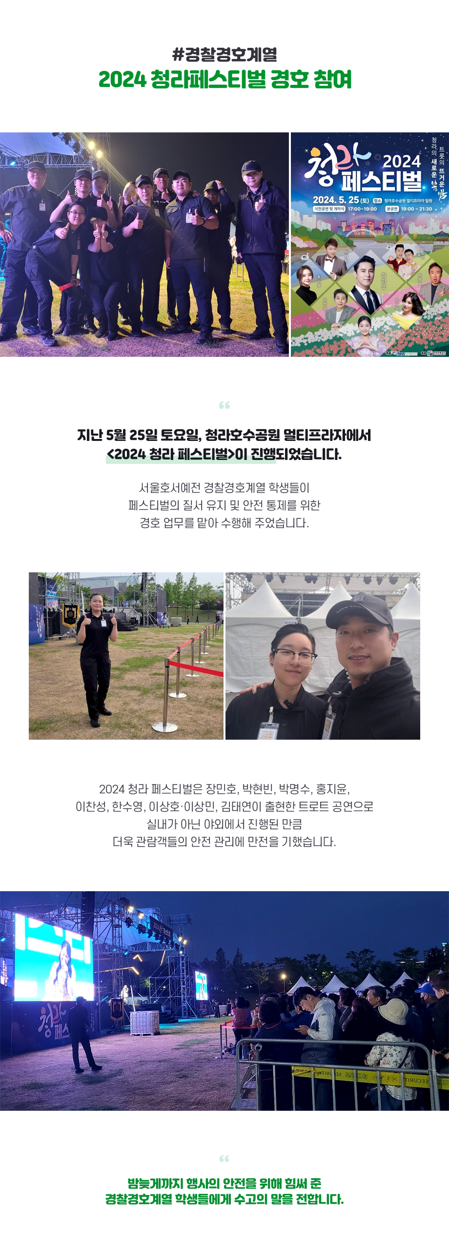 지난 5월 25일 토요일, 청라호수공원 멀티프라자에서 <2024 청라 페스티벌>이 진행되었습니다. 서울호서예전 경찰경호계열 학생들이 페스티벌의 질서 유지 및 안전 통제를 위한 경호 업무를 맡아 수행해 주었습니다.