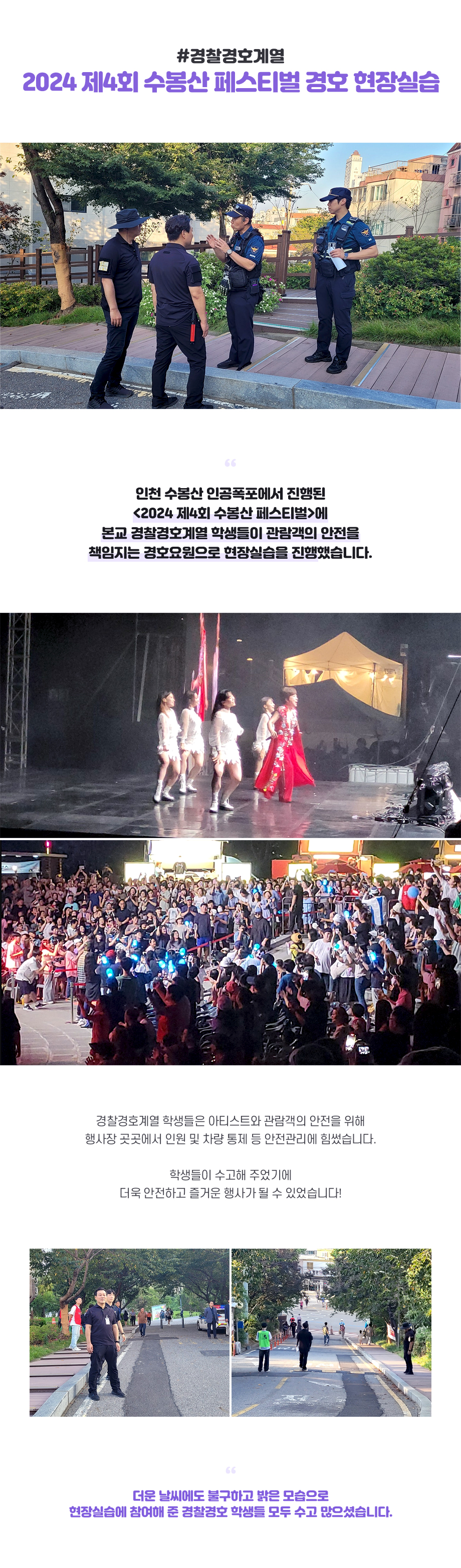 지난 9월 7일 토요일, 인천 수봉산 인공폭포에서 진행된 <2024 제4회 수봉산 페스티벌>에 본교 경찰경호계열 학생들이 관람객의 안전을 책임지는 경호요원으로 현장실습을 진행했습니다. 경찰경호계열 학생들은 아티스트와 관람객의 안전을 위해 행사장 곳곳에서 인원 및 차량 통제 등 안전관리에 힘썼습니다.