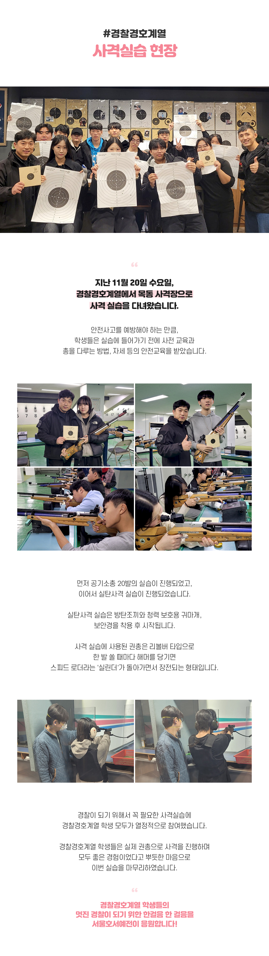 지난 11월 20일 수요일 경찰경호계열에서 목동 사격장으로 사격 실습을 다녀왔습니다. 안전사고를 예방해야 하는 만큼, 학생들은 실습에 들어가기 전에 사전 교육과 총을 다루는 방법, 자세 등의 안전교육을 받았습니다.