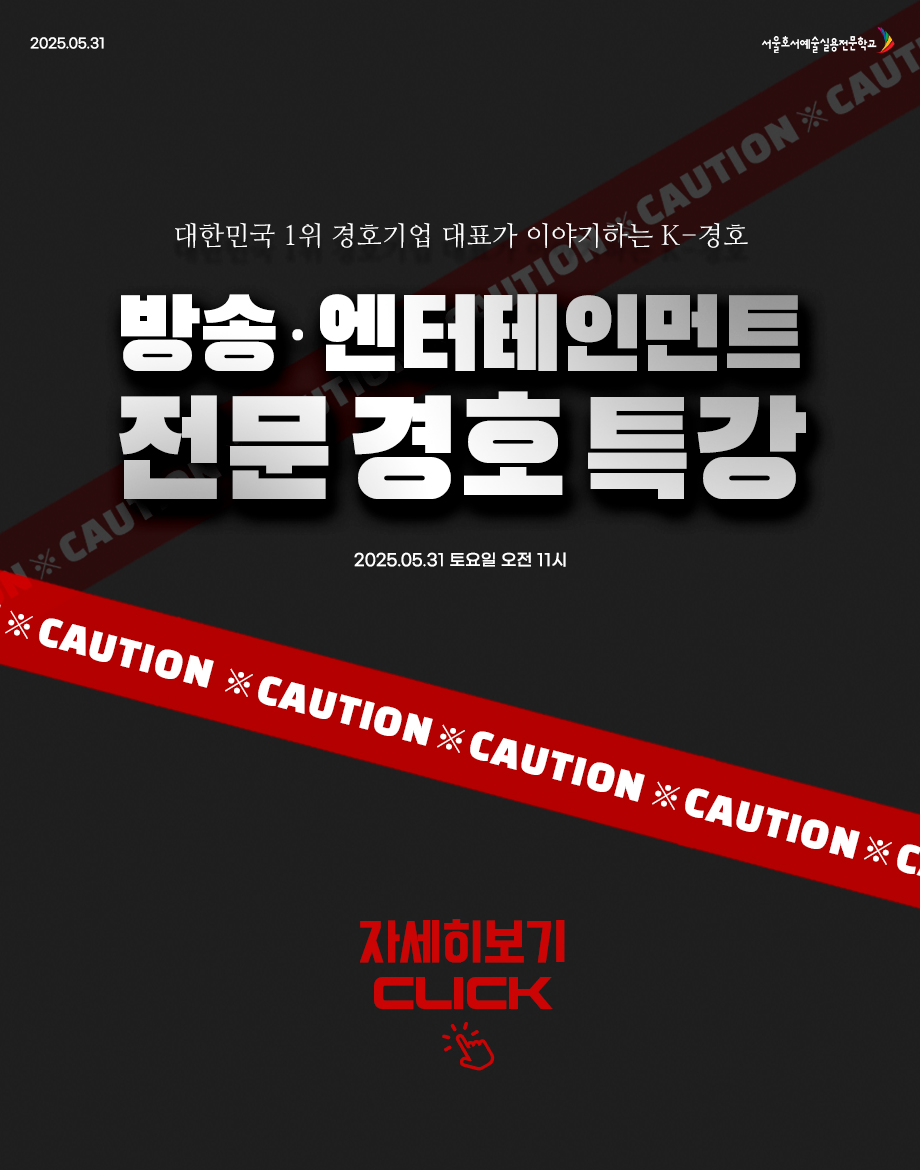 서울호서예술실용전문학교 경찰경호계열 대한민국 1위 경호기업 대표가 이야기하는 K-경호 방송·엔터테인먼트 전문 경호 특강 신청하기