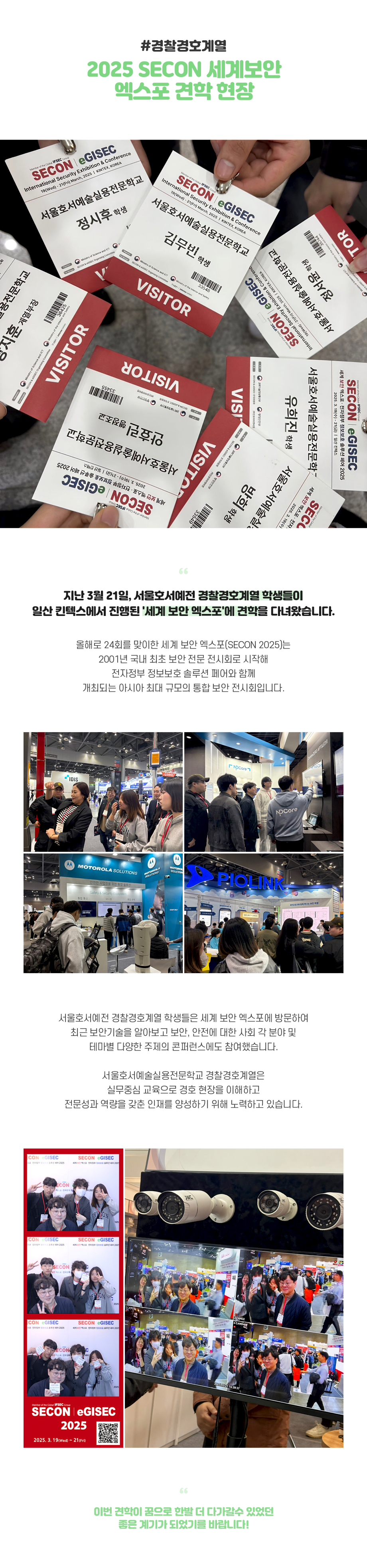 지난 3월 21일, 서울호서예술실용전문학교 경찰경호계열 학생들이 일산 킨텍스에서 진행된 '세계 보안 엑스포'에 견학을 다녀왔습니다. 올해로 24회를 맞이한 세계 보안 엑스포(SECON 2025)는 2001년 국내 최초 보안 전문 전시회로 시작해 전자정부 정보보호 솔루션 페어와 함께 개최되는 아시아 최대 규모의 통합 보안 전시회입니다.