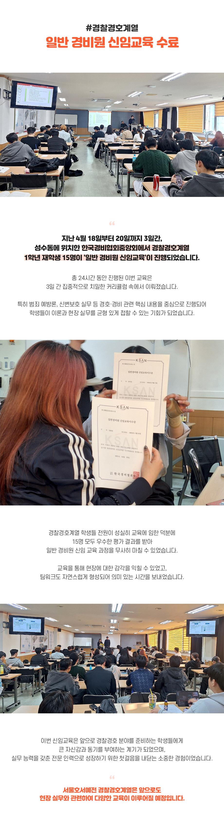지난 4월 18일부터 20일까지 3일간, 성수동에 위치한 한국경비협회중앙회에서 경찰경호계열 1학년 재학생 15명이 '일반 경비원 신임교육'이 진행되었습니다.