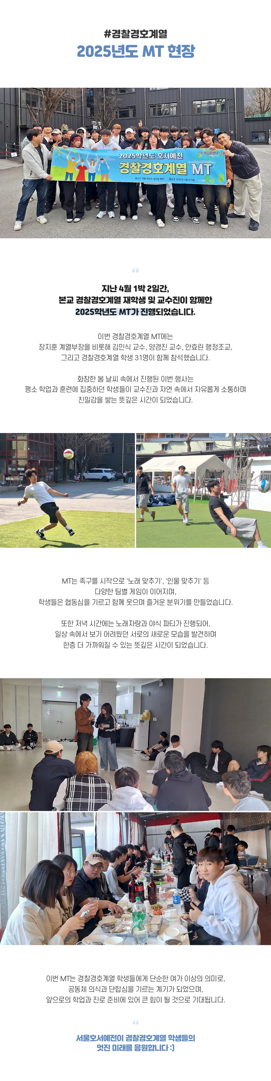 지난 4월 1박 2일간, 본교 경찰경호계열 재학생 및 교수진이 함께한 2025학년도 MT가 진행되었습니다. 이번 경찰경호계열 MT에는 장지훈 계열부장을 비롯해 김민식 교수, 양경진 교수, 안효린 행정조교, 그리고 경찰경호계열 학생 31명이 함께 참석했습니다.
