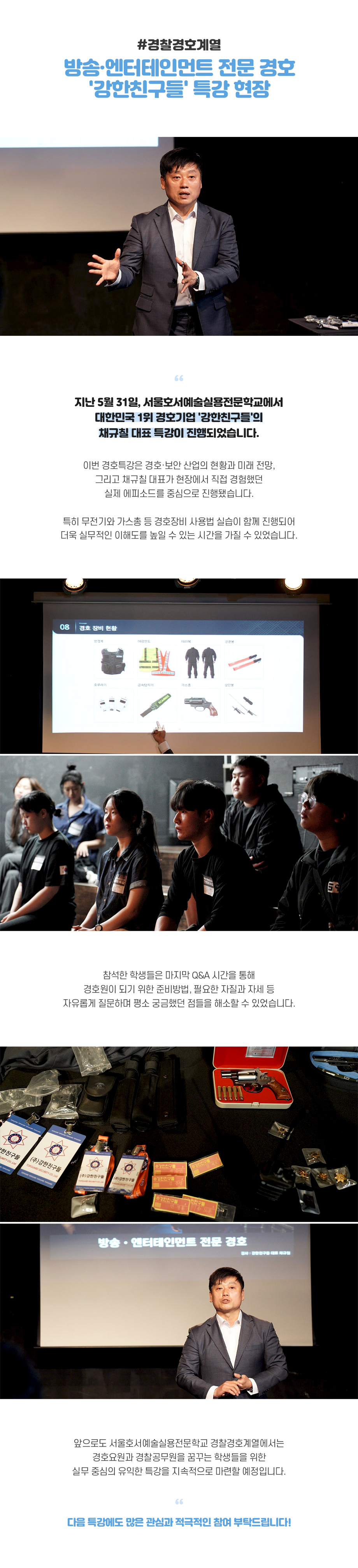 지난 5월 31일, 서울호서예술실용전문학교 소극장에서 대한민국 1위 경호기업 '강한친구들'의 채규칠 대표 특강이 진행되었습니다. 이번 경호특강은 경호·보안 산업의 현황과 미래 전망, 그리고 채규칠 대표가 현장에서 직접 경험했던 실제 에피소드를 중심으로 진행됐습니다.