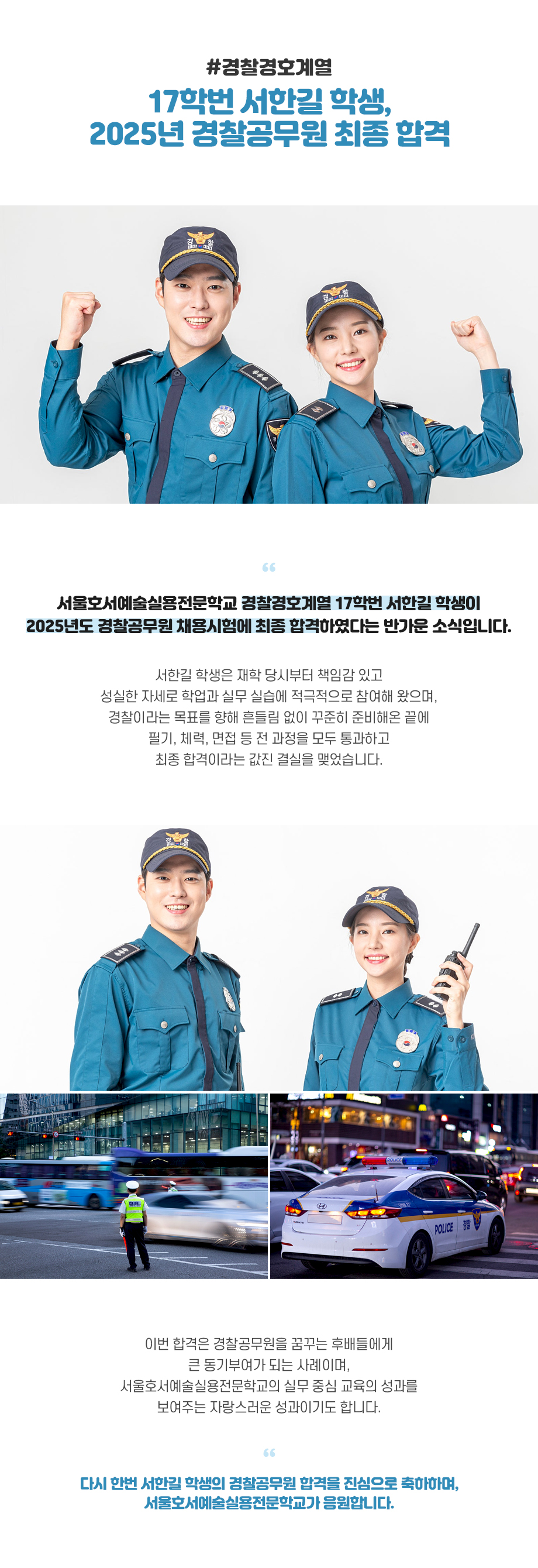 서울호서예술실용전문학교 경찰경호계열 17학번 서한길 학생이 2025년도 경찰공무원 채용시험에 최종 합격하였다는 반가운 소식입니다. 서한길 학생은 재학 당시부터 책임감 있고 성실한 자세로 학업과 실무 실습에 적극적으로 참여해 왔으며, 경찰이라는 목표를 향해 흔들림 없이 꾸준히 준비해온 끝에 필기, 체력, 면접 등 전 과정을 모두 통과하고 최종 합격이라는 값진 결실을 맺었습니다.
