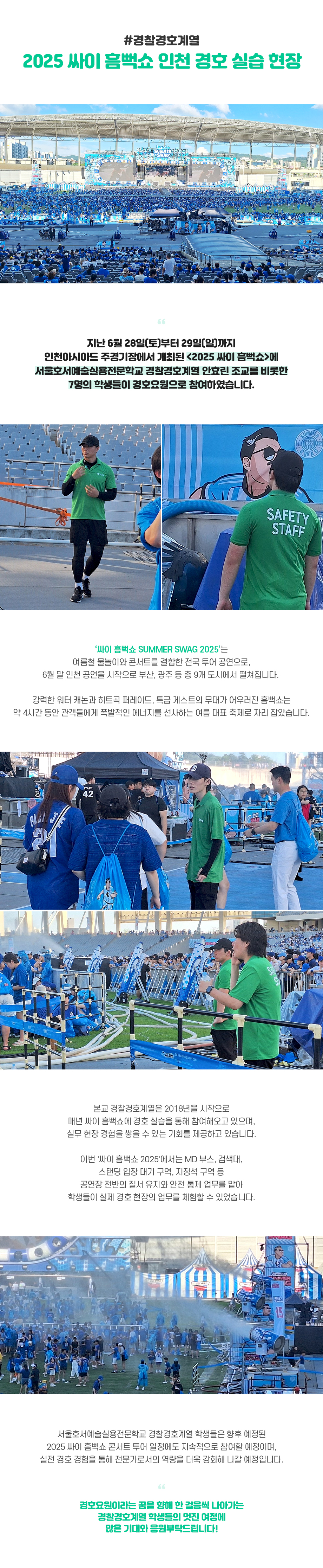 지난 6월 28일(토)부터 29일(일)까지 인천아시아드 주경기장에서 개최된 <2025 싸이 흠뻑쇼>에 서울호서예술실용전문학교 경찰경호계열 안효린 조교를 비롯한 7명의 학생들이 경호요원으로 참여하였습니다. ‘싸이 흠뻑쇼 SUMMER SWAG 2025’는 여름철 물놀이와 콘서트를 결합한 전국 투어 공연으로, 6월 말 인천 공연을 시작으로 부산, 광주 등 총 9개 도시에서 펼쳐집니다.