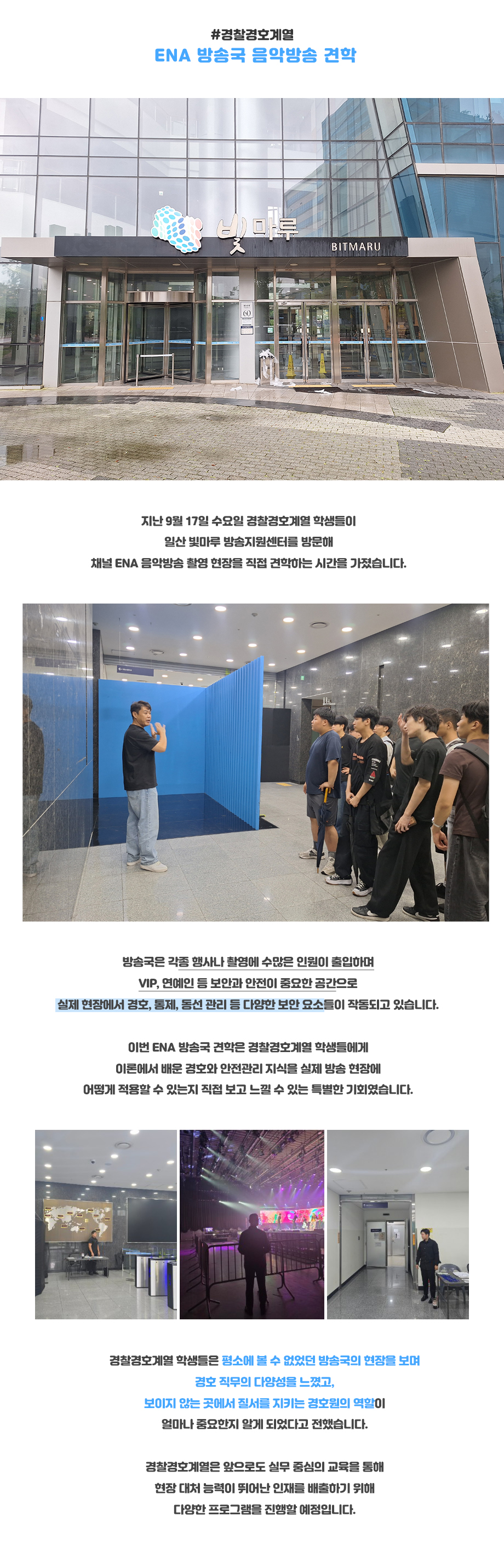지난 9월 17일 수요일 경찰경호계열 학생들이 일산 빛마루 방송지원센터를 방문해 채널 ENA 음악방송 촬영 현장을 직접 견학하는 시간을 가졌습니다.