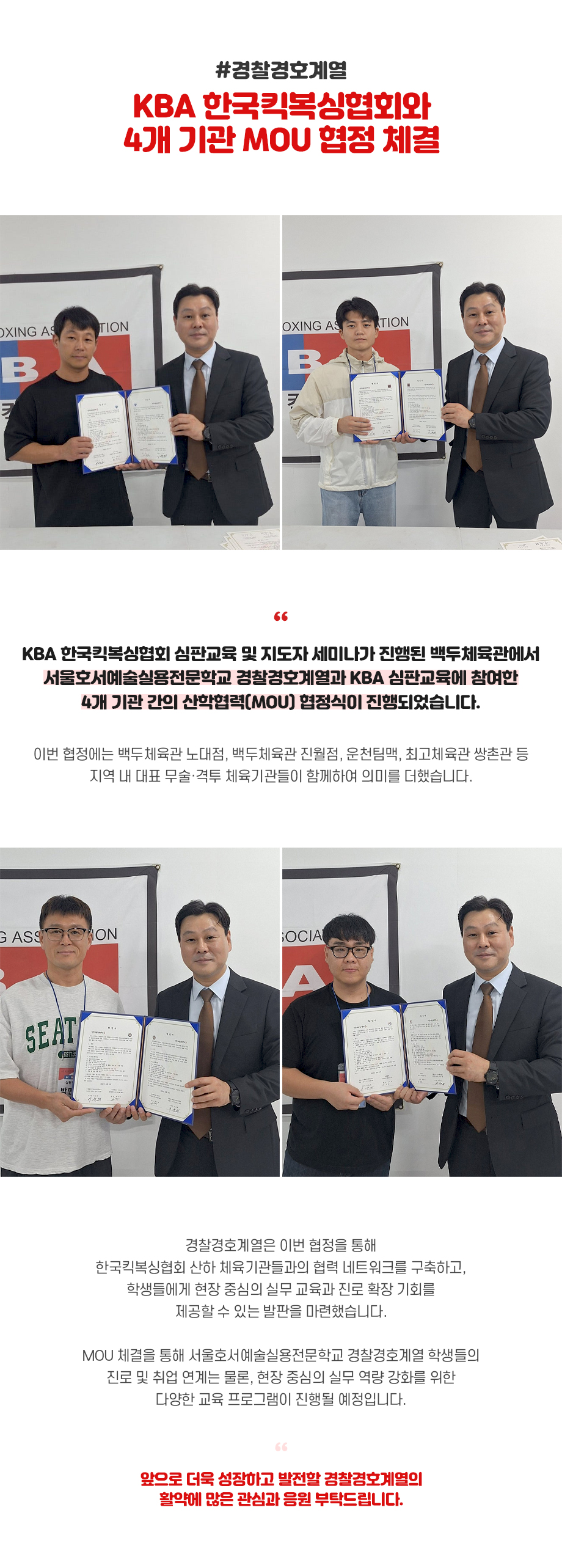 KBA 한국킥복싱협회 심판교육 및 지도자 세미나가 진행된 백두체육관에서 서울호서예술실용전문학교 경찰경호계열과 KBA 심판교육에 참여한 4개 기관 간의 산학협력(MOU) 협정식이 진행되었습니다.