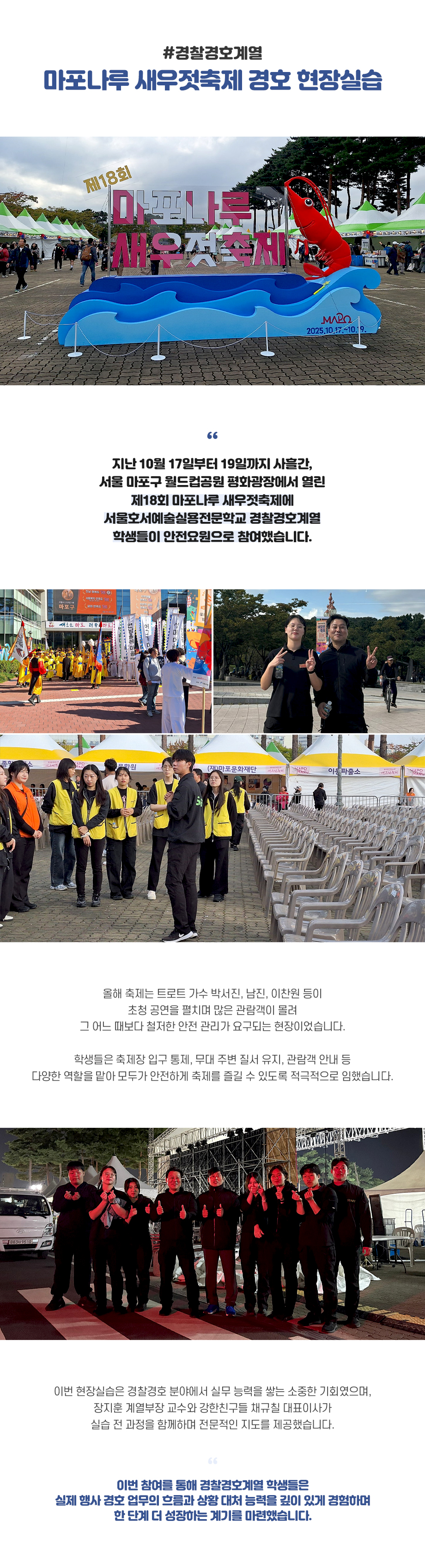 지난 10월 17일부터 19일까지 사흘간, 서울 마포구 월드컵공원 평화광장에서 열린 제18회 마포나루 새우젓축제에 서울호서예술실용전문학교 경찰경호계열 학생들이 안전요원으로 참여했습니다.