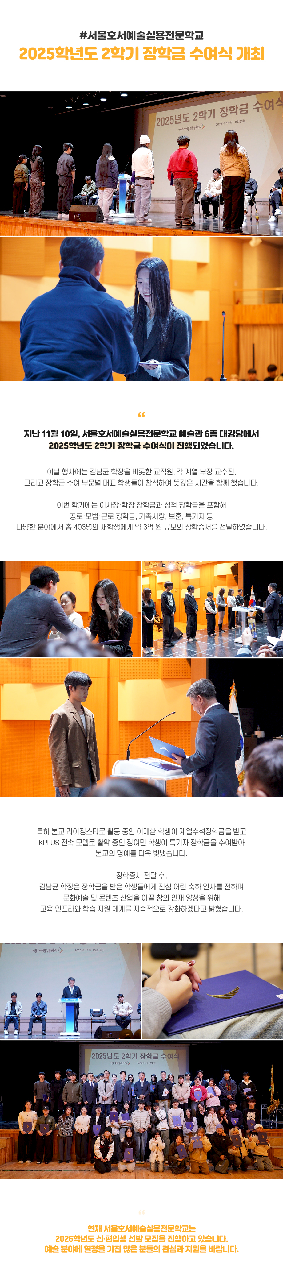 지난 11월 10일, 서울호서예술실용전문학교 예술관 6층 대강당에서 2025학년도 2학기 장학금 수여식이 진행되었습니다.