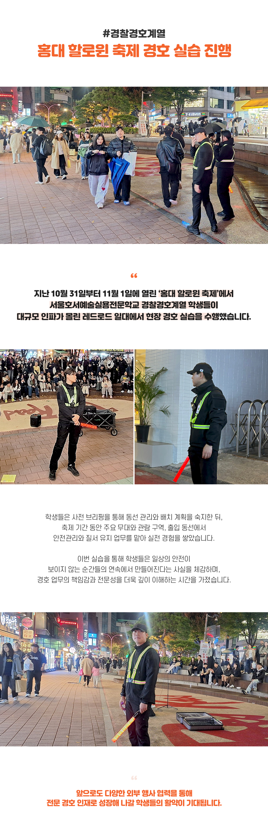 지난 10월 31일부터 11월 1일에 열린 ‘홍대 할로윈 축제’에서 서울호서예술실용전문학교 경찰경호계열 학생들이 대규모 인파가 몰린 레드로드 일대에서 현장 경호 실습을 수행했습니다.