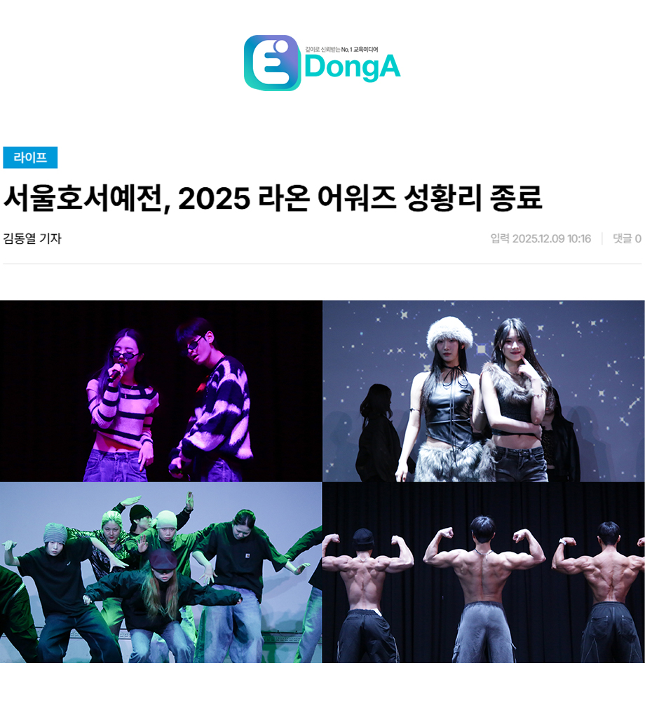 서울호서예전 김남균 학장은 “2025년을 빛낸 모든 수상자에게 진심으로 축하를 전하며, 앞으로도 서울호서예전은 학생들이 재능을 마음껏 펼칠 수 있도록 아낌없이 지원해 나가겠다”고 전했다.
