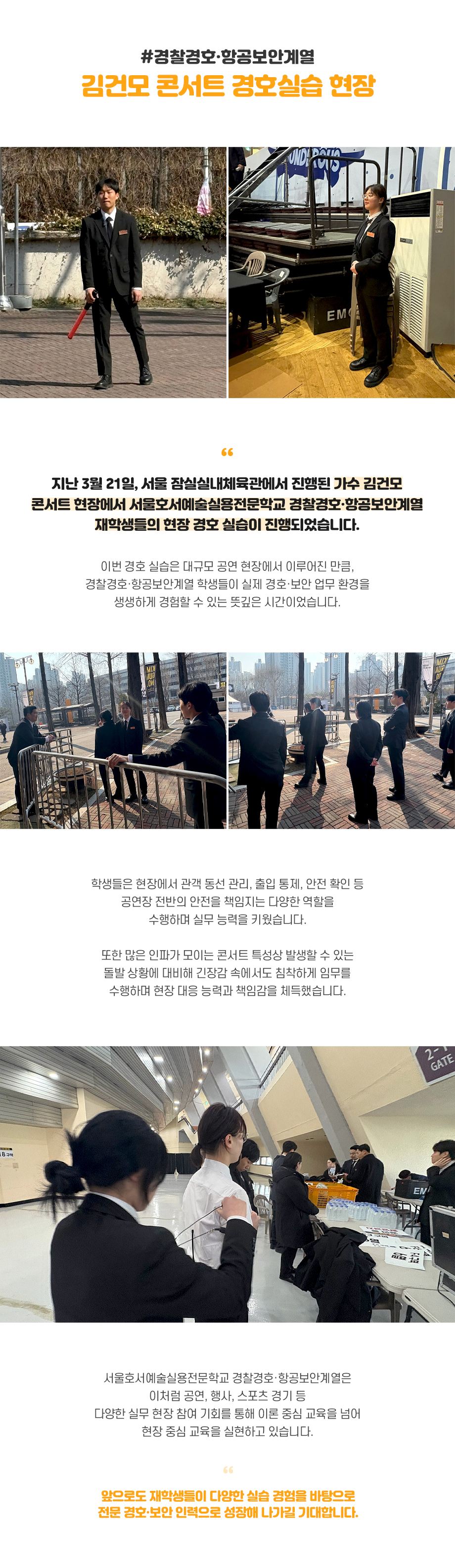 지난 3월 21일, 서울 잠실실내체육관에서 진행된 가수 김건모 콘서트 현장에서 서울호서예술실용전문학교 경찰경호·항공보안계열 재학생들의 현장 경호 실습이 진행되었습니다.