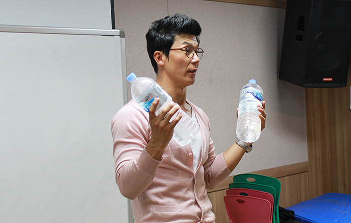 늘 페트병에 물을 가득담아 시간이 날때 마다 운동을 한다는 이정용 교수!