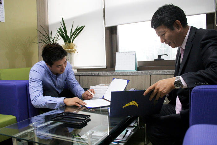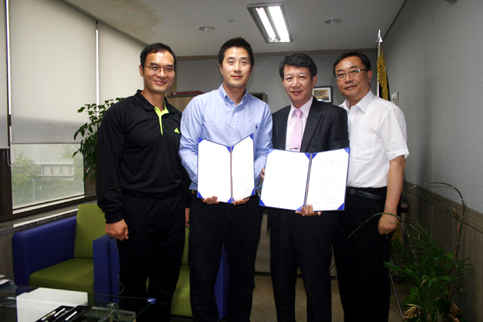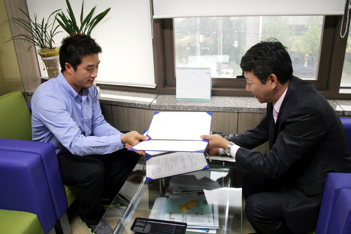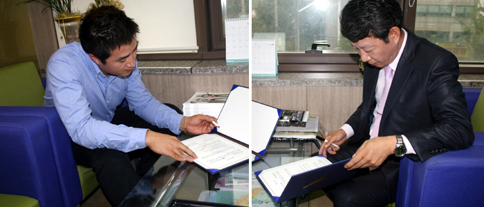 <협약서에 서명 후 교환하고 계시는 CnB 퍼스널 트레이너 교육컨설팅 최철민 대표와 본교 김남균 학장>