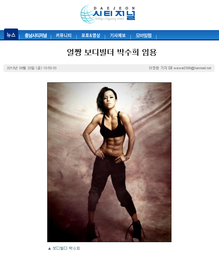 [ 시티저널 이정현 기자 ] 본교는 “2013년 2학기부터 얼짱 보디빌더 박수희를 스포츠건강관리학부 교수로 임용했다"고 밝혔다.
