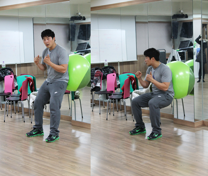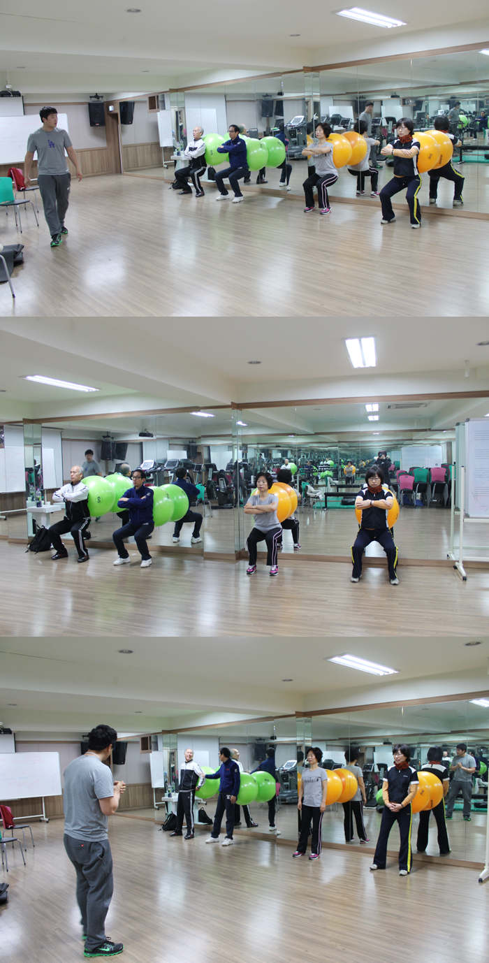 짐볼을 허리를 주축으로 기대고 허리를 쭉펴고 다리는 최철민 교수님처럼 정확한┌ 모양이 되야한답니다! 평소에 건강하셨던 분들이시라면 쉽게 자세가 나오지만 평소에 허리가 좋지 않았거나 선생님들처럼 오래 서있는 직업이신 분들에게는 딱 맞는 운동인데요.