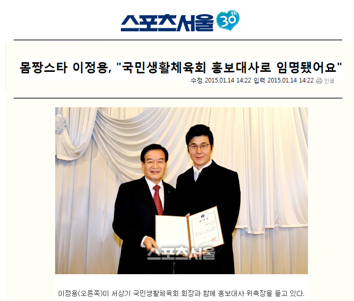 꾸준한 관리로 40대중반에도 20대 못지않은 몸매를 자랑하는 배우 이정용이 대한민국 국민들의 생활체육을 책임지는 국민 생활 체육회의 홍보 대사 위촉장을 받았다.