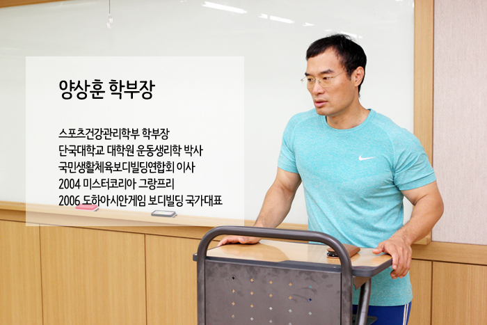 스포츠건강관리학부 양상훈 학부장은 20년 넘는 선수경력과 국가대표 경력을 토대로 멋진 몸을 만들고자 하는 트레이너, 일반인, 전문선수 지원자, 다이어트를 하는 여성들에게 올바른 웨이트 트레이닝과 영양, 보충제 섭취법, 시함준비기술 등을 알려준다고 합니다~