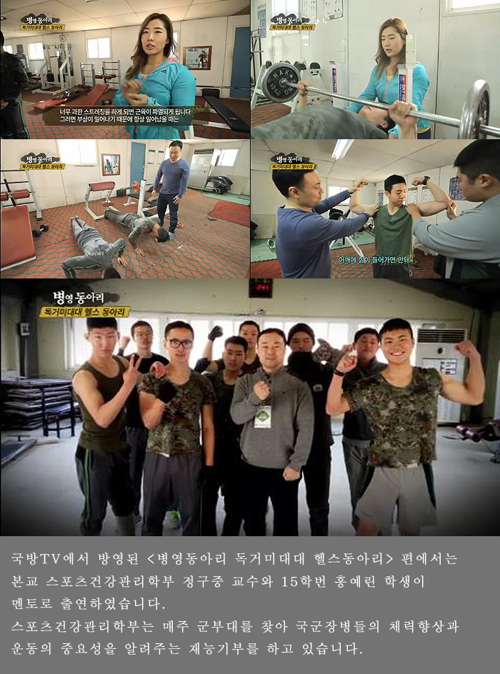스포츠건강관리학부의 정구중 교수와 재학생 홍혜린 학생이 국방TV 병영동아리 독거미대대 헬스동아리 편에 출연하였습니다.