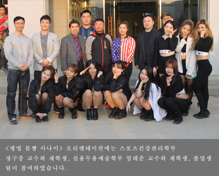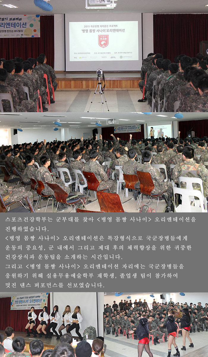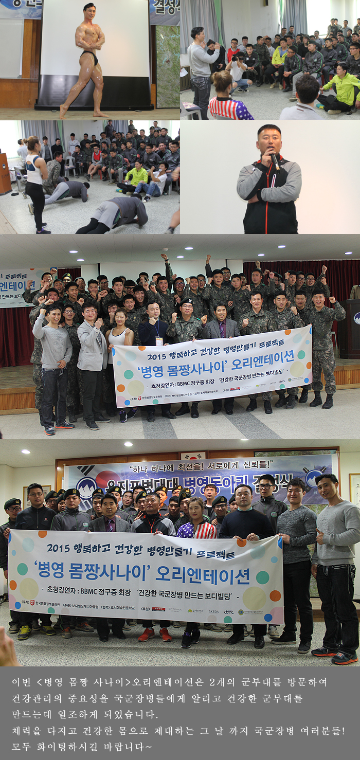 정구중 교수가 대표로 있는 BBMC(보디빌딩 마니아 클럽)와 스포츠건강관리학부, 실용무용예술학부가 함께 모여 2015 행복하고 건강한 병영만들기 프로젝트 <병영 몸짱 사나이> 오리엔테이션을 개최하였습니다.