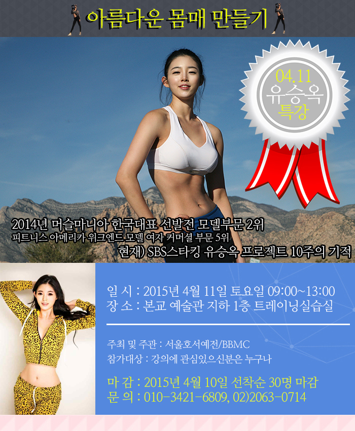 본교는 4월11일(토) 진학설명회와 함께 스포츠건강관리학부에 아름다운 몸매 만들기 ‘유승옥’특강을 개최합니다. 몸매 종결자로 유명한 유승옥은 지난해 11월 미국 라스베이거스에서 열린 머슬마니아 세계대회에서 동양인 최초로 모델 커머셜 부문톱 5에 올랐고, 머슬마니아 한국대표 선발전 모델부문 2위를 수상해서 이슈가 되었습니다. 최근에는 SBS 놀라운대회 스타킹에서 몸매를 위한 운동법을 전수했고, 드라마 출연 등 활발한 활동을 하고 있습니다.