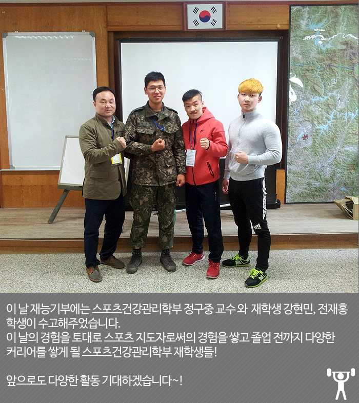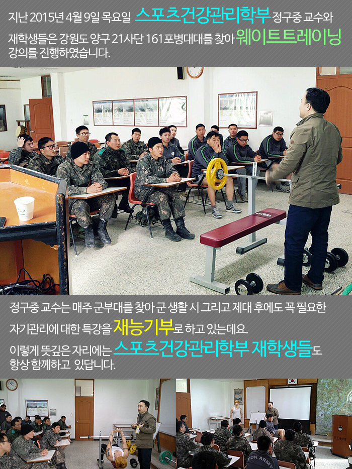 스포츠건강관리학부 정구중 교수와 재학생들은 지난 4월 9일 강원도 양구21사단 161포병대대를 찾아 웨이트트레이닝 강의를 진행하였습니다.
