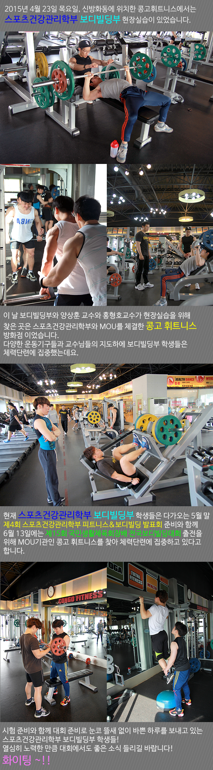 2015년 4월 23일 목요일 스포츠건강관리학부 보디빌딩부 현장실습이 신방화동에 위치한 콩고휘트니스에서 있었습니다.