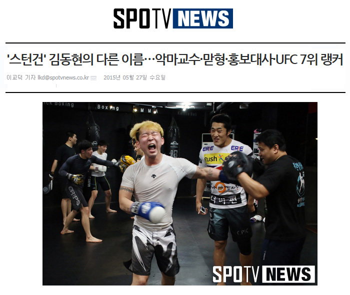 180도 상반된 경기스타일로 '스턴건'과 '매미'라는 두 가지 별명을 지닌 김동현은 '악마교수' 이전에 대한민국을 대표하는 파이터다. 2004년 스피릿MC를 통해 데뷔해 2008년 9승 1무의 프로 전적으로 옥타곤에 진출, 한국인 1호 UFC 파이터가 됐다.
