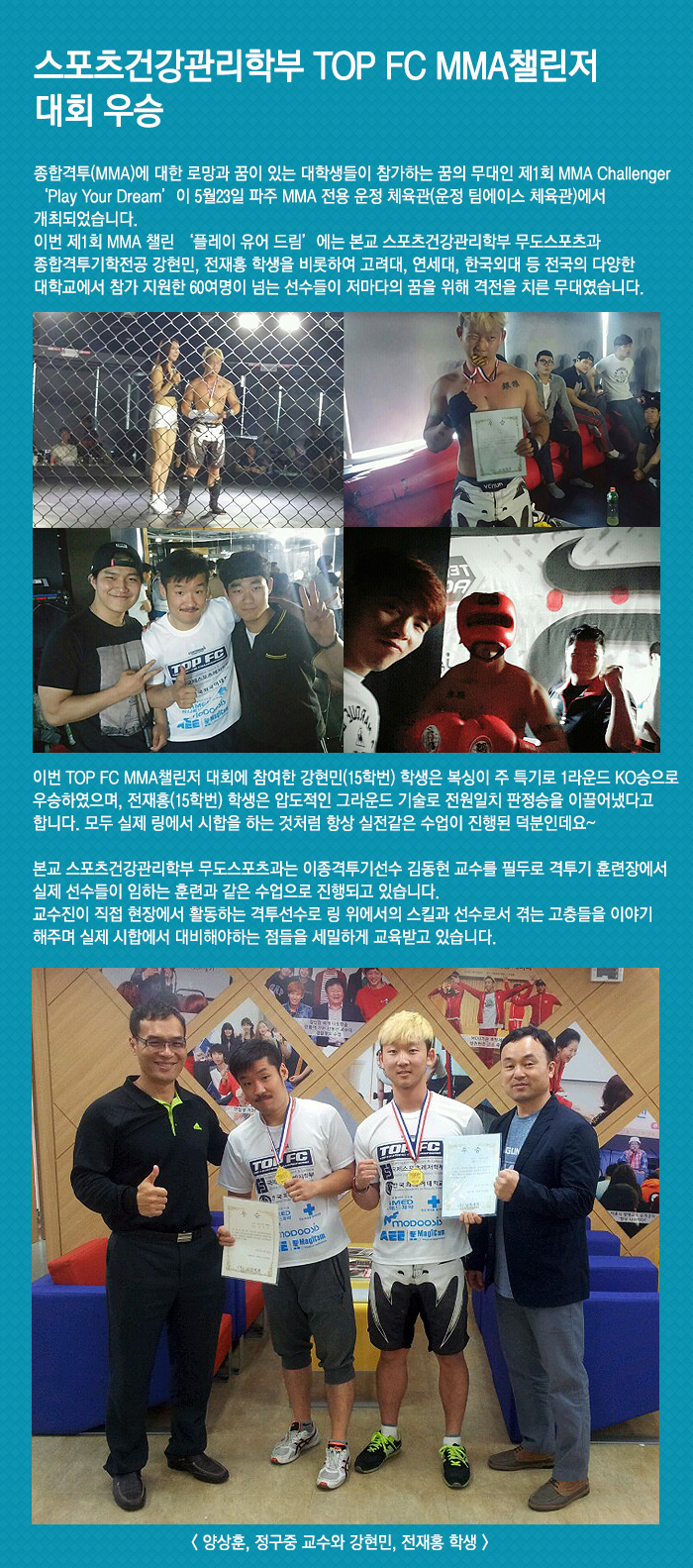 이번 제1회 MMA 챌린 ‘플레이 유어 드림’에는 본교 스포츠건강관리학부 무도스포츠과 종합격투기학전공 강현민, 전재홍 학생을 비롯하여 고려대, 연세대, 한국외대 등 전국의 다양한 대학교에서 참가 지원한 60여명이 넘는 선수들이 저마다의 꿈을 위해 격전을 치른 무대였습니다.