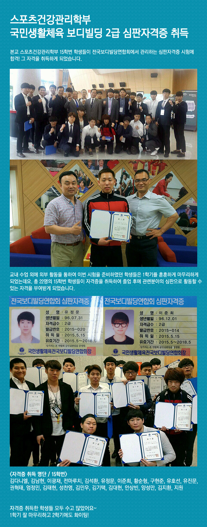 본교 스포츠건강관리학부 15학번 학생들이 전국보디빌딩연합회에서 관리하는 심판자격증 시험에 합격! 그 자격을 취득하게 되었습니다.
