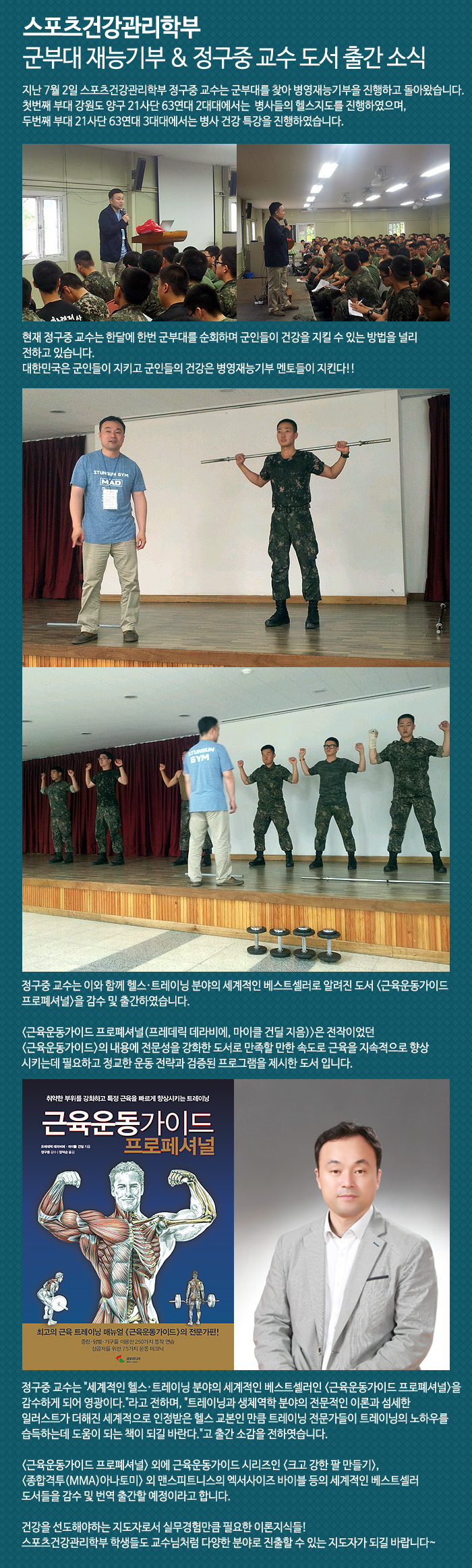 지난 7월 2일 스포츠건강관리학부 정구중 교수는 군부대를 찾아 병영재능기부을 진행하고 돌아왔습니다.