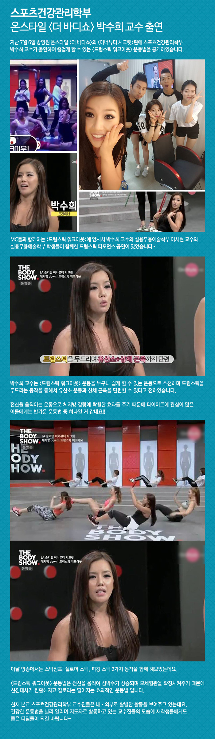지난 7월 6일 방영된 온스타일 <더 바디쇼>의 <이너뷰티 시크릿>편에 스포츠건강관리학부 박수희 교수가 출연하여 즐겁게 할 수 있는 <드림스틱 워크아웃> 운동법을 공개하였습니다.